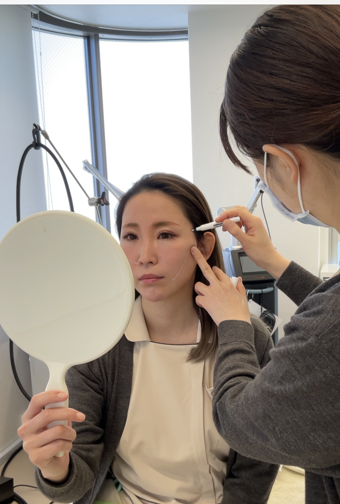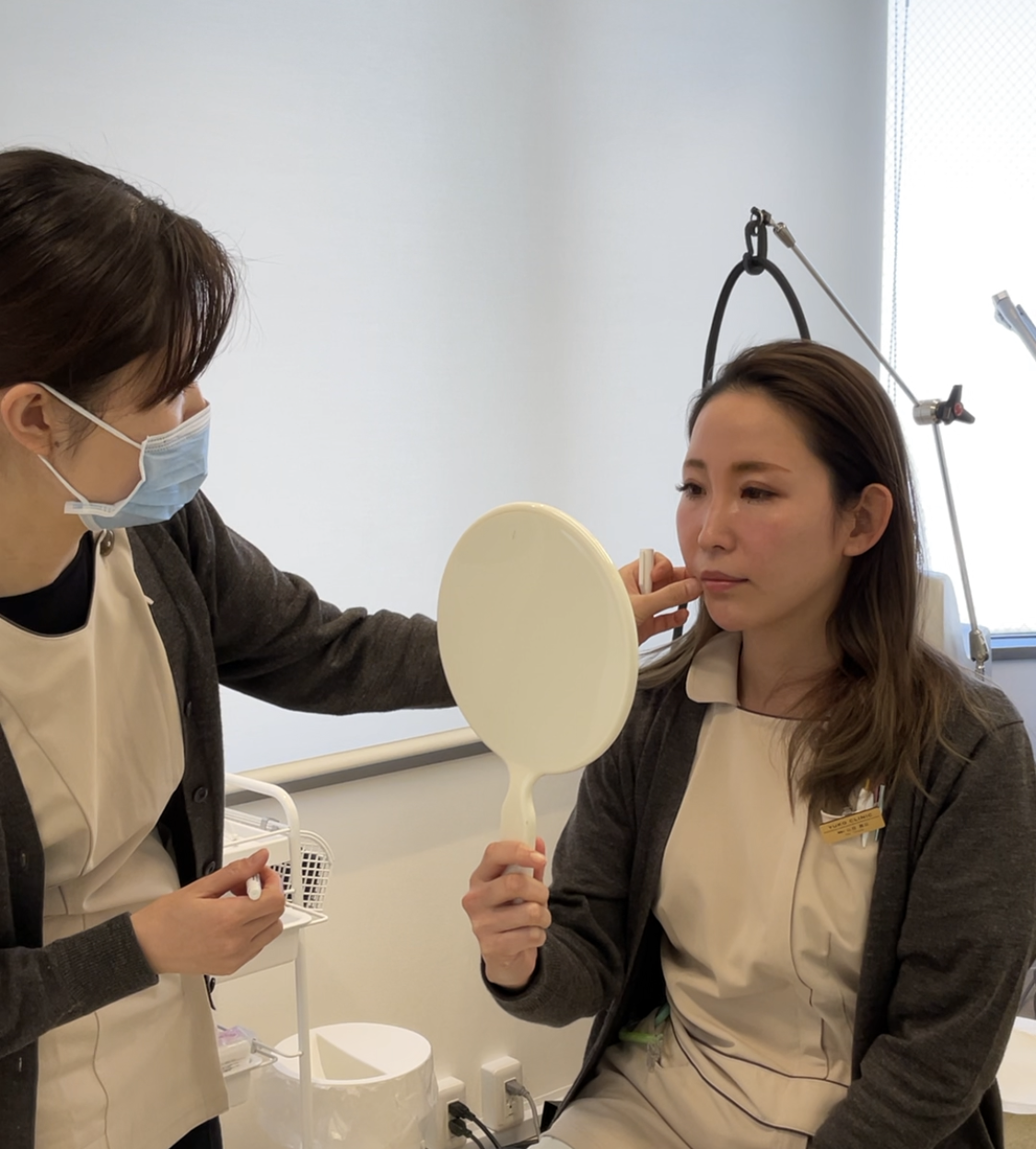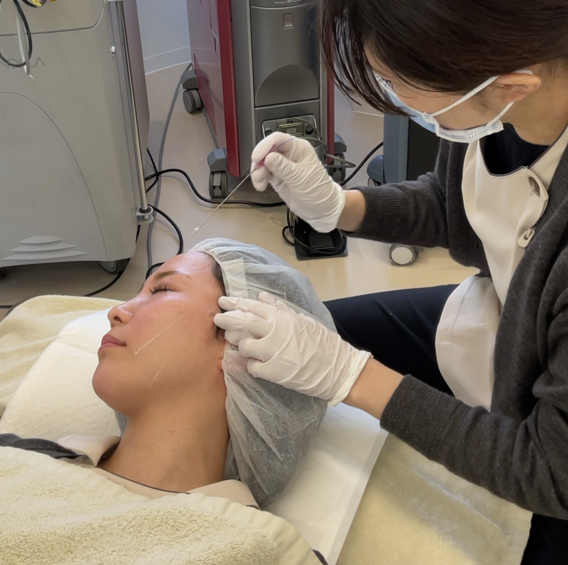 糸を入れたあと、座って頂き、バランス、糸の引っ張り具合を調節し、最後に皮膚から出ている糸はカットします。✂️