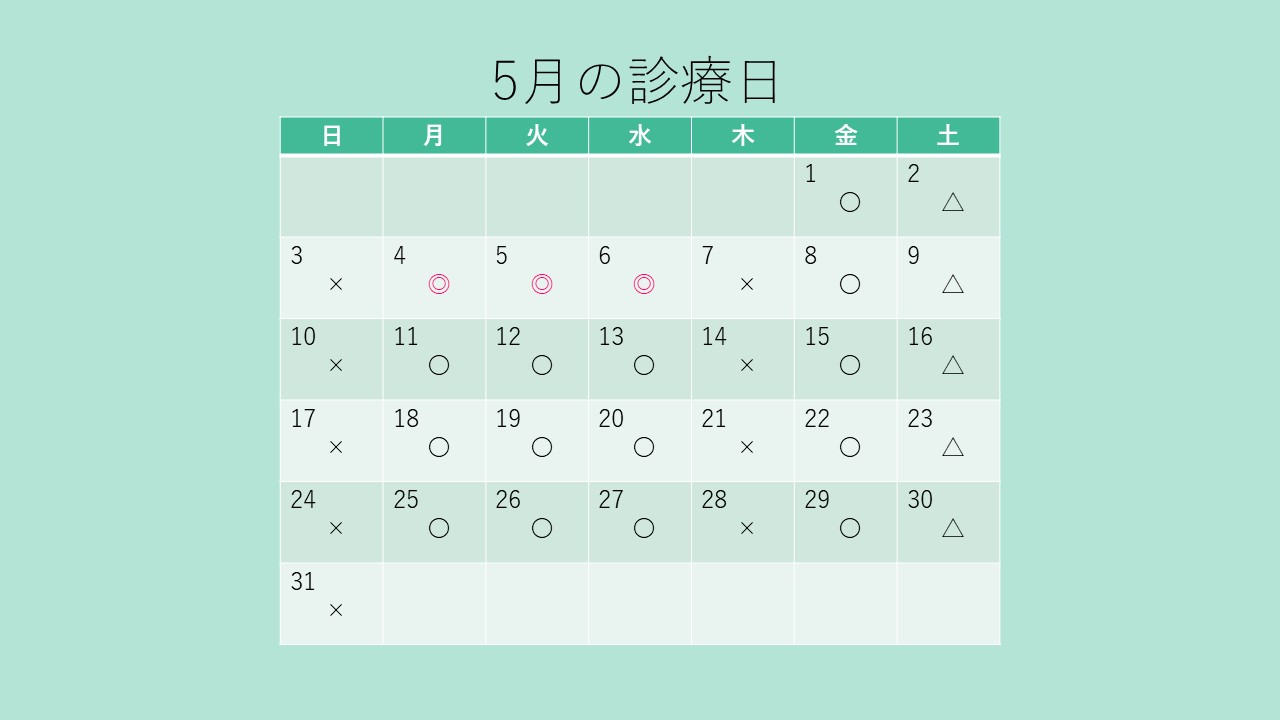 5月診療日のお知らせ 祝日4日(月)5日(火)6日(水)は診療しております
